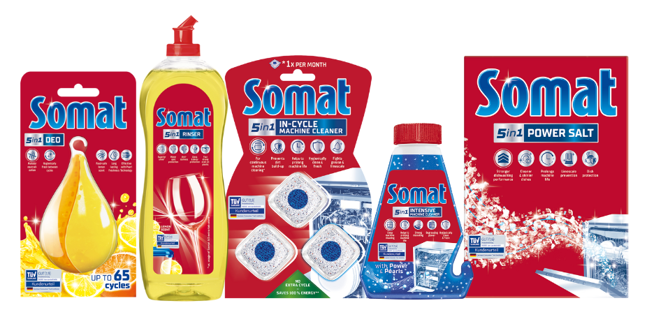 S radom Somat aditív 5v1 zaistíte dokonalú čistotu nielen riadu, ale aj samotného mechanizmu umývačky. Pravidelné používanie týchto produktov pomáha predchádzať usadzovaniu vodného kameňa, eliminuje zápach a odstraňuje mastnotu aj z ťažko dostupných miest. Výsledkom je hygienicky čistá umývačka, žiarivo lesklý riad a hlavne o starosť menej v čase, keď si chcete užiť predovšetkým pokoj a pohodovú atmosféru.