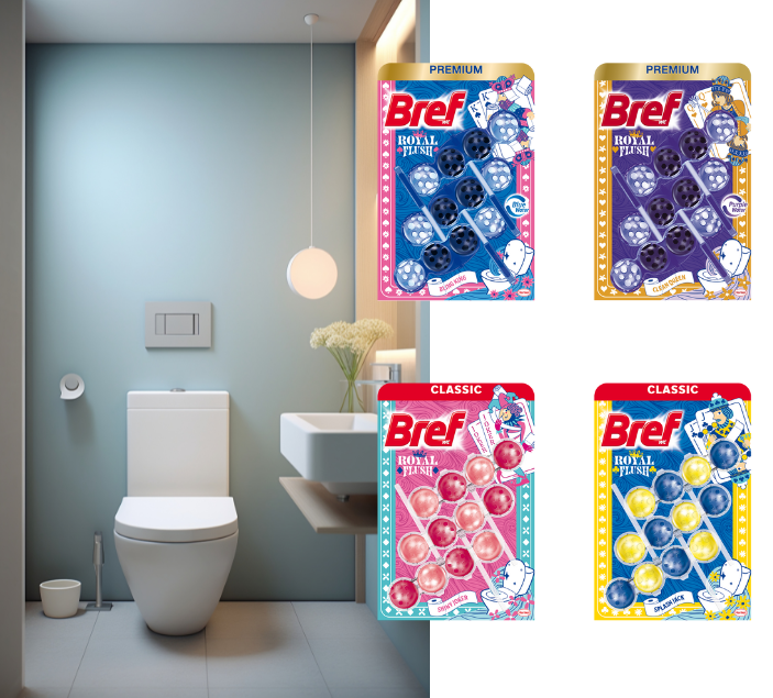 Súčasťou starostlivosti o kúpeľňu je, samozrejme, aj toaleta. Nová kolekcia WC blokov Bref ponúka nielen čistotu, ale aj dizajn a originalitu. Zahrajte svoju víťaznú partiu s novou limitovanou edíciou Bref, ktorá vás prenesie do sveta kráľov, kráľovien a voňavých triumfov. Všetky WC bloky z edície kombinujú overené benefity značky Bref – štyri aktívne zložky, ktoré čistia, chránia proti vodnému kameňu, penia a prevoňajú toaletu pri každom spláchnutí. Výsledkom je nielen dokonale čistá misa, ale predovšetkým dlhotrvajúca sviežosť, ktorá premení každú návštevu toalety na malý luxusný rituál.